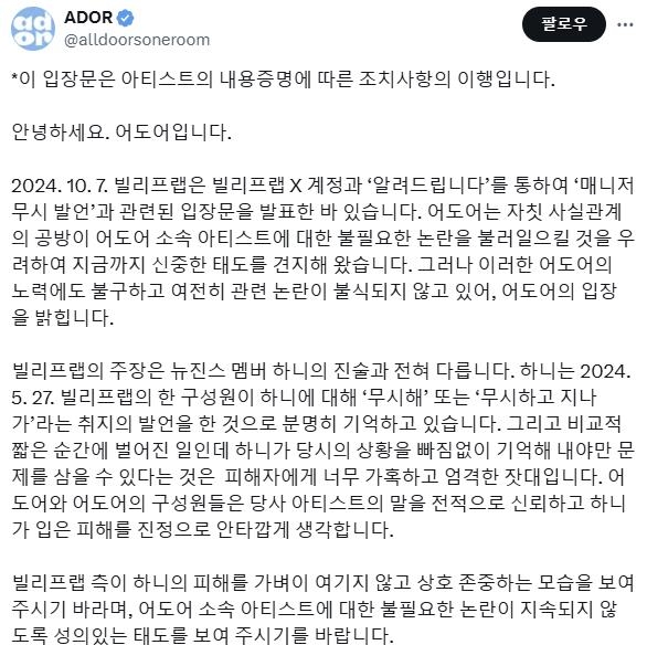 어도어 입장문 [어도어 엑스 캡처. 재판매 및 DB 금지]