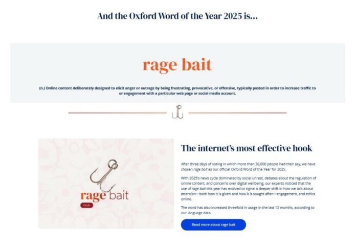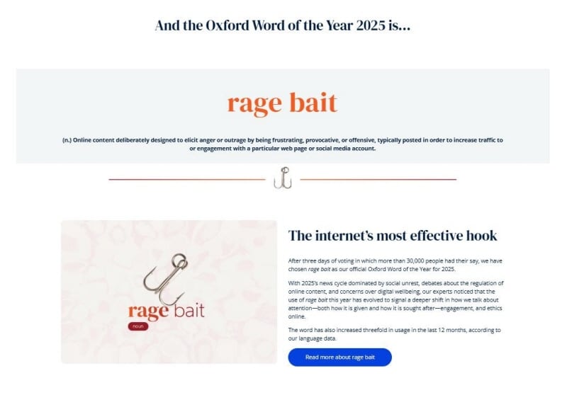 캐스퍼 그래스월 옥스퍼드 랭귀지스 사장은 인터뷰에서 “분노 미끼라는 말이 존재하고 그 사용이 급증했다는 사실은 우리가 온라인에서 빠질 수 있는 조작 전술을 인식하는 경우가 늘고 있다는 것”이라고 설명했다.