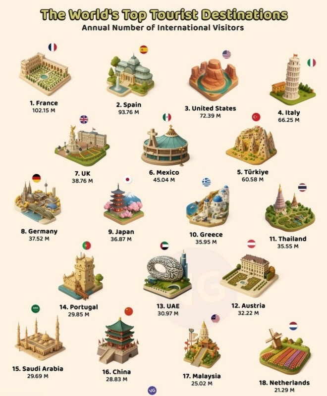 이탈리아, 튀르키예(터키), 멕시코, 영국, 독일, 일본, 그리스 등도 각각 4위에서 10위권에 이름을 올렸다. 특히 일본과 그리스는 팬데믹 이후 관광 회복세가 두드러지며 순위 상승세를 보였다.