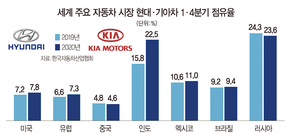 14일 한국자동차산업협회에 따르면 올 1·4분기 현대·기아차는 미국·유럽·중국·인도·멕시코·브라질·러시아 등 해외 주요 자동차 시장 7곳 중 중국과 러시아를 제외한 5곳에서 지난해 동기 대비 시장점유율을 확대했다. 지난해 기준으로 이들 7대 자동차 시장은 세계 자동차 판매량(8,695만대)의 93.2%를 차지한다.