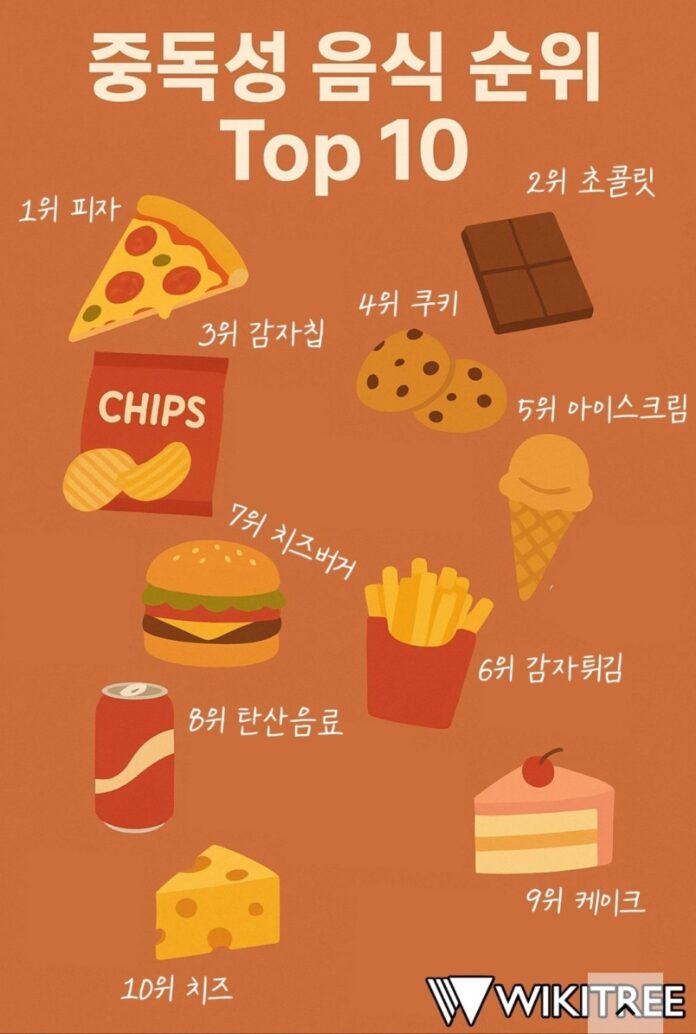 중독성이 강한 음식 순위를 살펴보면 피자가 1위를 차지했고, 이어 초콜릿, 감자칩, 쿠키, 아이스크림이 상위 5위에 올랐다.
