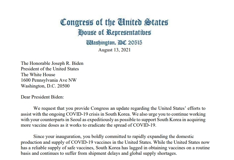 이들은 한미동맹의 중요성을 강조하면서 “미국 정부는 한국이 백신을 용이하고 신속하게 확보할 수 있도록 더 협조해야 한다”고 덧붙였다.