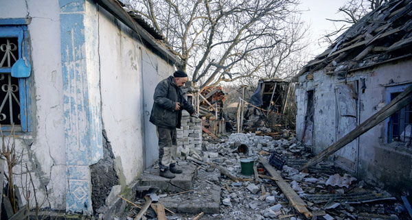 20일 우크라이나 동부 도네츠크 지역의 한 주민이 포격으로 부서진 건물을 가리키고 있다. [로이터]