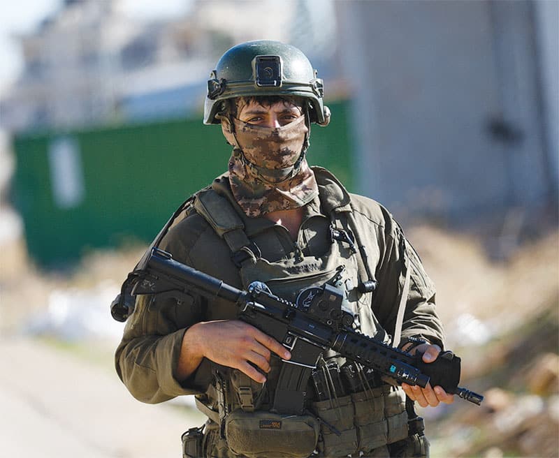 중무장한 이스라엘 병사가 서안지구 이스라엘 정착촌에서 경계를 서고 있다. 로이터