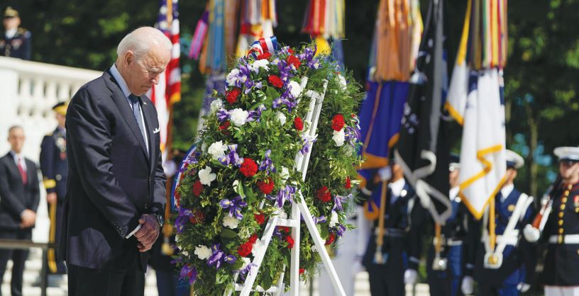 조 바이든 대통령이 메모리얼데이를 맞아 31일 알링턴 국립묘지를 방문해 헌화하고 묵념하고 있다. <로이터>