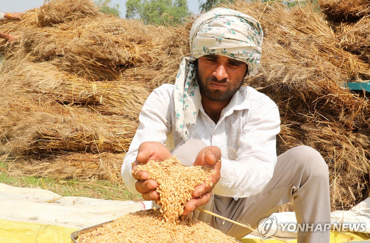 인도 뉴델리 외곽에서 수확한 밀을 보여주는 농부(기사와 무관)-EPA 연합뉴스 자료사진. 재판매 및 DB 금지