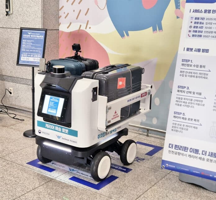 행정안전부는 10일 인천국제공항공사, 인천광역시, 인천 중구청과 함께 ‘AI·주소 기반 이동지능정보 사업 확산을 위한 업무협약(MOU)’을 체결하고 제1터미널에서 캐리어 배송 로봇과 순찰 로봇을 추가로 시범 운영한다고 밝혔다. 이번 사업은 주소 정보를 활용해 공항 내 이동을 돕는 서비스를 실증하고 확대하기 위한 목적이다.