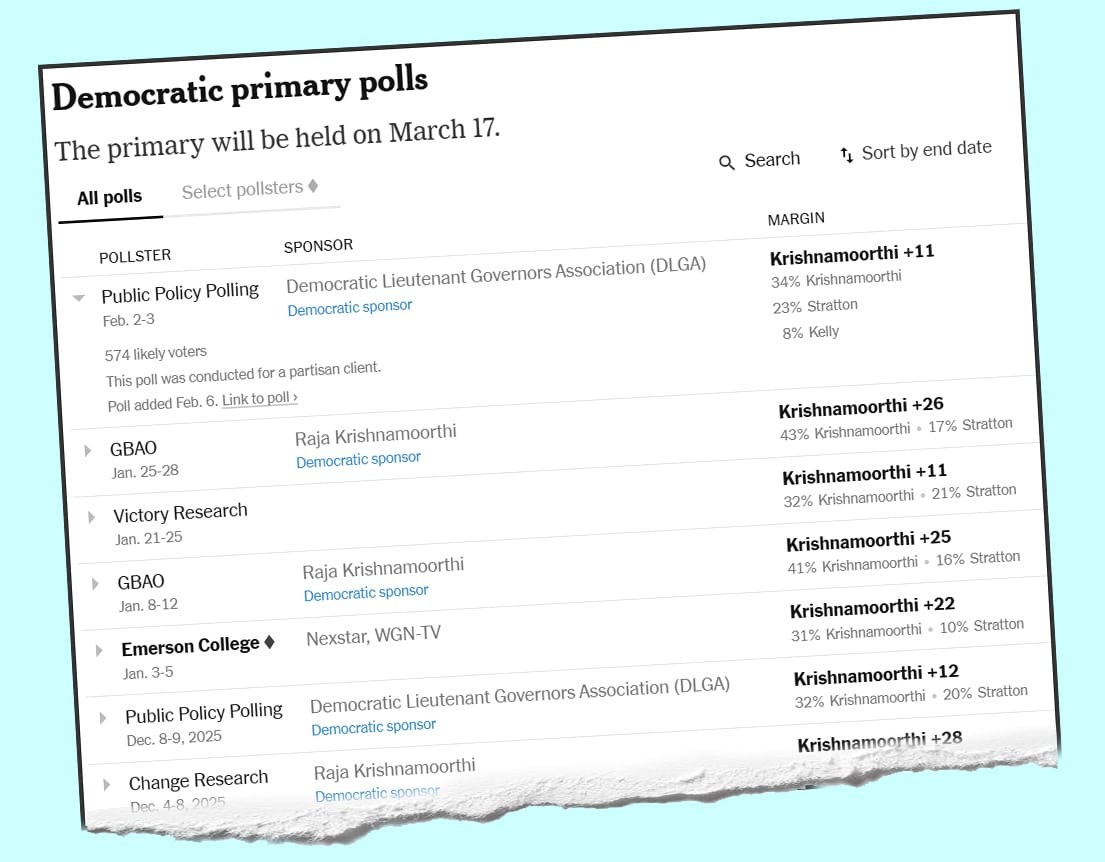 오는 3월 17일 치러질 민주당 예비선거를 앞두고 퍼블릭 폴리시 폴링(PPP) 조사에서는 크리슈나무르티 의원이 34%, 줄리아나 스트래튼 부지사가 23%를 기록하며 11%포인트 차이를 보였다. 1월 말 GBAO 조사에서는 43% 대 17%로 격차가 26%포인트까지 벌어졌고, 1월 초 에머슨 대학 조사에서도 31% 대 10%로 큰 차이를 나타냈다. 지난해 9월과 12월 조사에서도 크리슈나무르티 의원은 15~28%포인트 범위에서 안정적인 선두를 유지했다. 일부 조사에서는 연방 하원의원인 로빈 켈리도 후보로 포함됐으며, 11월 조사에서는 크리슈나무르티 29%, 켈리 22%로 나타났다.
