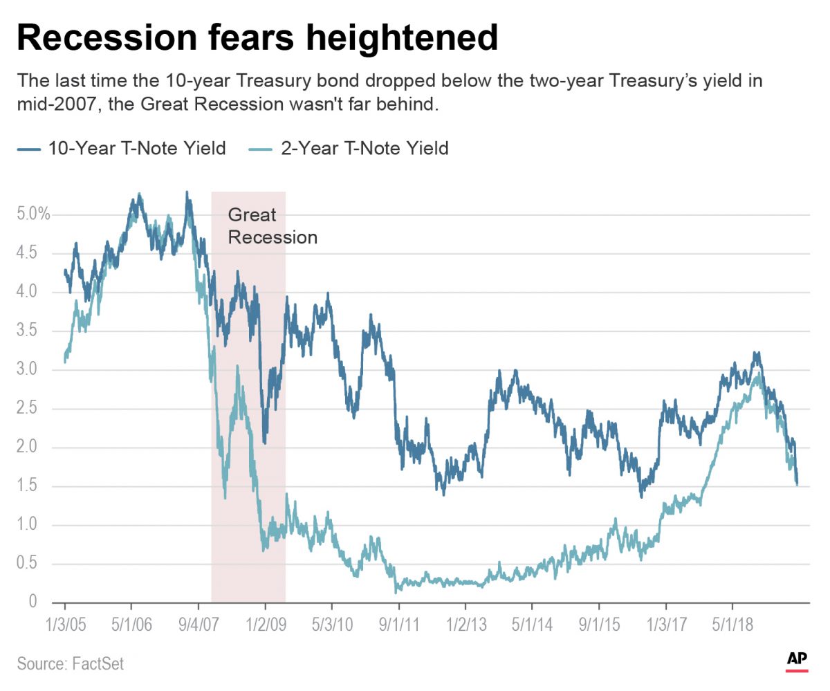 CNBC 보도에 따르면, 미국 국채 2년물 금리와 10년물 금리는 지난 26일 역전된 채 장을 마친 뒤 27일에는 장중 한때 각각 1.526%와 1.476%로 격차가 0.05%포인트까지 벌어졌다. 미국 국채 2년물과 10년물의 역전된 금리 격차는 지난 2007년 3월 이후 최대다. 미국 국채 2년물의 금리가 10년물 금리보다 높아진 장단기 금리 역전은 대표적인 경기침체 전조 현상으로 여겨진다. 2년물과 10년물 금리 역전 현상은 2005년 12월 이후 이달 들어 처음 발생했다.