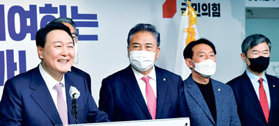 윤석열(맨 왼쪽) 국민의힘 대선 후보가 지난 24일 재외동포청 설치 등을 포함한 외교안보 공약을 발표하고 있다. [국민의힘 제공]