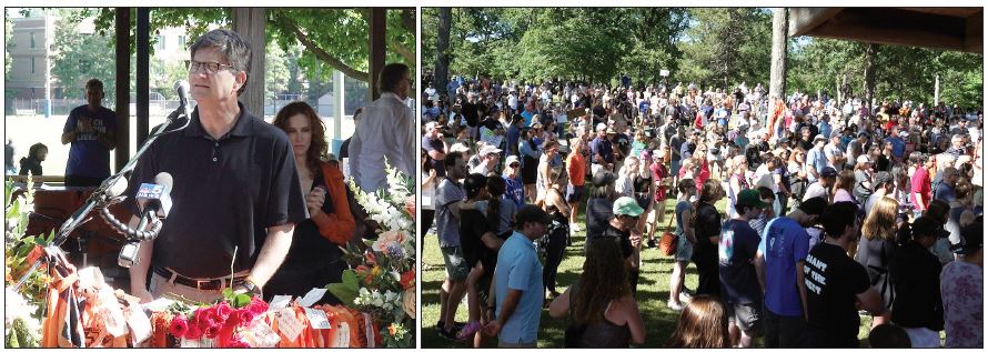 하일랜드팍 주민들을 위로하기 위해 모인 위로견(Comfort Dog)4일 독립기념일에 하이랜드팍에서 벌어진 무차별 총기 난사로 인해 희생된 7명의 사망자를 추모하기 위한 애도의 시간들이 마련되고 있다. 지난 9일 선셋우드 공원에서는 총기 난사에서 구사일생으로 목숨을 구한 사람들, 지역활동가, 하이랜드팍 청소년 그룹 및 지역사회 지도자들이 총기규제 집회를 갖고 사상자들을 추모하고 강력한 총기 규제를 외쳤다. 그들은 주 및 연방 차원에서 더 이상 이런 어처구니 없는 총기 사건이 발생하지 않도록 신속한 조치를 취할 것을 요구하였다. 동시에 이번 사건 용의자가 2020년도에 어떻게 합법적으로 일리노이주에서 총기를 구입할 수 있었는지에 대한 의문도 제기하고 나섰다.