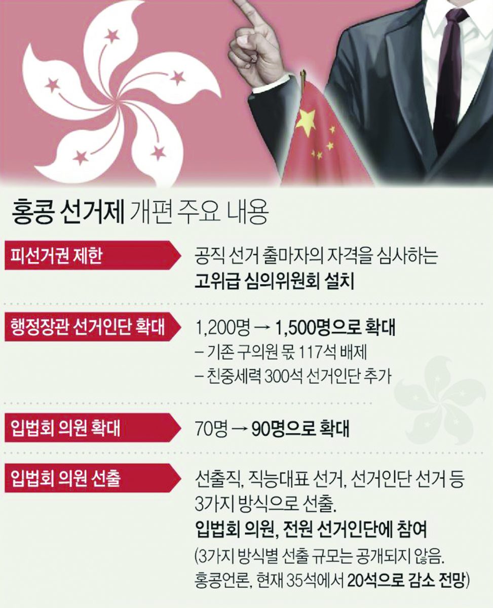 전인대는 11일 전체 회의에서 홍콩 선거제 초안이 통과되면 조만간 상무위원회를 열어 승인한 뒤 홍콩법에 삽입해 시행에 들어갈 예정이다. 리커창 중국 총리는 이날 전인대 폐막 기자회견에서 “홍콩 선거제를 개편한 것은 일국양제의 제도적 보완과 애국자가 홍콩을 다스린다는 원칙을 견지하기 위한 것”이라며 “우리는 일국양제와 홍콩인이 홍콩을 다스린다(港人治港), 고도자치(高度自治) 방침을 관철하며 헌법과 기본법에 따라 엄격히 일을 처리할 것”이라고 밝혔다.