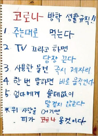 #한모씨는 임시 휴교로 집에만 있는 3남매와 ‘전쟁’을 선포했다. 나갈 곳 없이 집에만 갇혀 있다 보니 아이들은 아이들대로 힘들어 하고 자주 다퉈 한국 SNS에서 최근 인기를 끌고 있는 ‘코로나 방학 생활규칙’을 자신의 집에 적용하기로 했다. 5항의 생활규칙은 ‘주는 대로 먹는다. 유튜브 끄라고 하면 당장 끈다. 사용한 물건은 즉시 제 자리에 둔다. 한 번 말하면 바로 움직인다. 엄마에게 쓸데없이 말 걸지 않는다’로 현재의 ‘웃픈’(우스우면서 슬픈) 상황을 대변해 준다.
