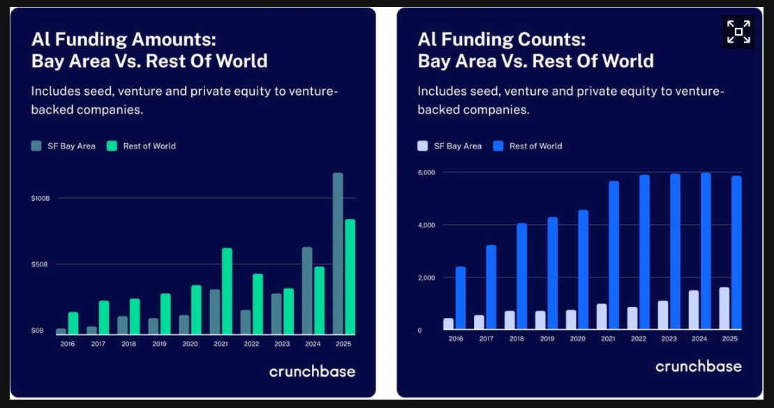 베이 지역에 대한 AI 투자 집중도가 깊어지면서 미국 AI 기업에 대한 투자 비중도 1천660억 달러로 전체의 79%를 기록했다.