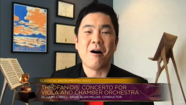오닐은 14일 유튜브를 통해 중계된 제63회 그래미어워즈의 프리미어 세리머니(사전 시상식)에서 이 부문 수상자로 호명됐다. 수상 작품은 오닐이 데이비드 앨런 밀러의 지휘로 알바니 심포니 오케스트라와 함께 연주한 테오파니디스의 ‘비올라와 체임버 오케스트라를 위한 협주곡’이다.