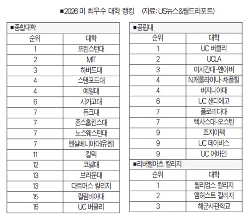 대학 순위 평가 전문지인 US뉴스 & 월드리포트가 23일 발표한 2026 학년도 전국 대학 평가에서 프린스턴대가 종합대학 부문 1위에 다시 올랐다.