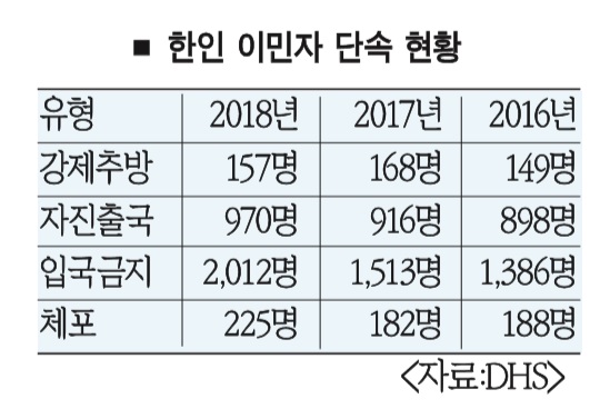 지난 2018년 한해 동안 강제 추방된 한인 이외에 자진출국 형식으로 한국으로 되돌려 보내진 한국인도 970명으로 전년도 916명 보다 5.9% 가량 증가한 것으로 조사됐다. 특히 공항 또는 항구, 국경 등에서 입국이 금지된 한국인은 2,012명으로 전년도 1,513명 보다 무려 33% 증가했다. 아울러 불법을 저질러 이민 단속망에 체포된 한인 역시 225명으로 전년도 182명보다 23.6% 늘었다.