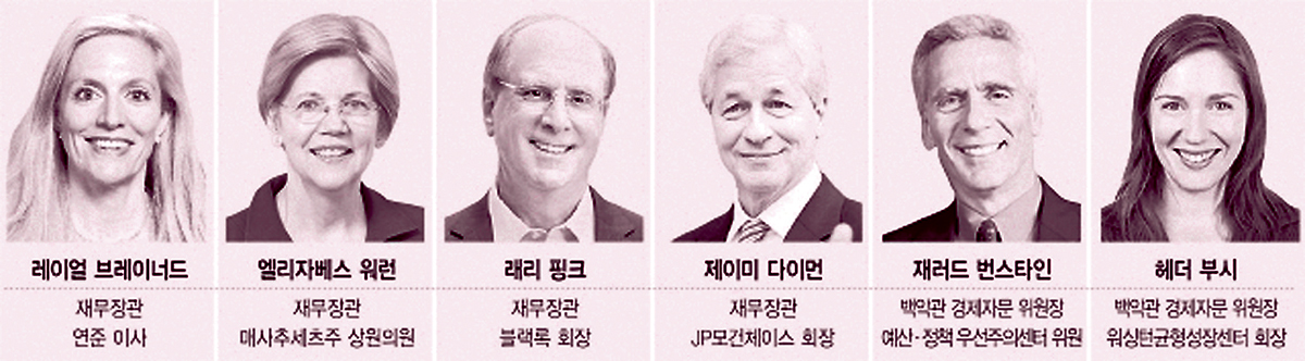 바이든캠프의 돈줄 역할을 했던 민간기업 수장들도 거론되고 있다. 자산운용사 블랙록의 래리 핑크 회장과 투자은행 JP모건체이스의 제이미 다이먼 회장이 대표적이다. 하지만 미 NBC방송은 잠재적으로 수조달러의 경기부양을 감독하며 경제회복을 주도할 재무장관이 민간 부문과 밀접한 관계가 있는 상황이 되기는 힘들 것이라고 분석했다.