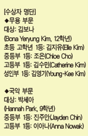 무용 부문에서는 스티븐슨 고등학교 12학년에 재학 중인 김보나(주간한국 1면 표지모델) 학생이 창작무용 ‘얼굴 너머, 또 다른 숨결’로 수상의 영예를 안았다.