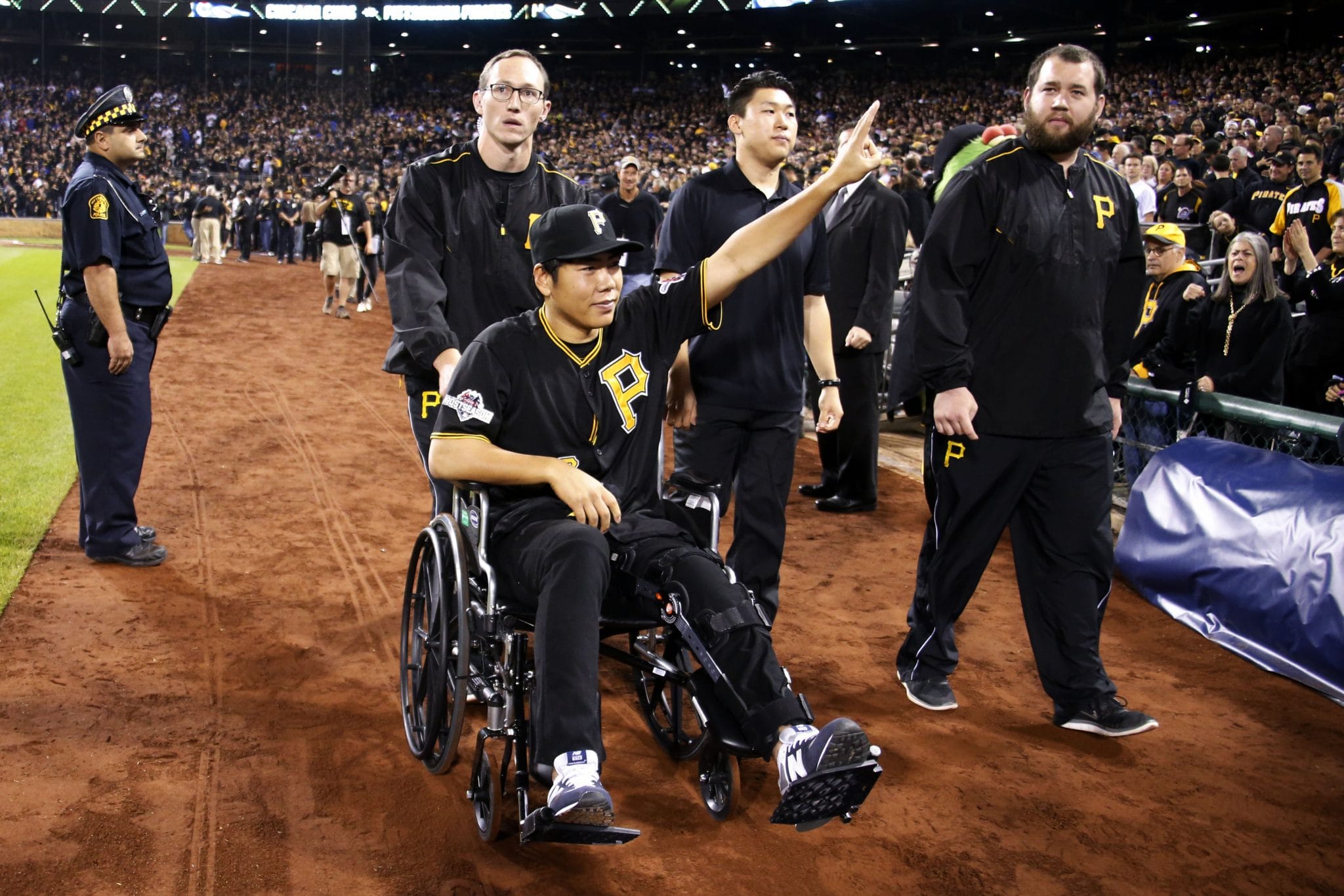 이날 강정호가 경기 시작전 선수 소개 때 휠체어를 타고 등장하면서 팬들의 환호에 답하고 있다.<AP>