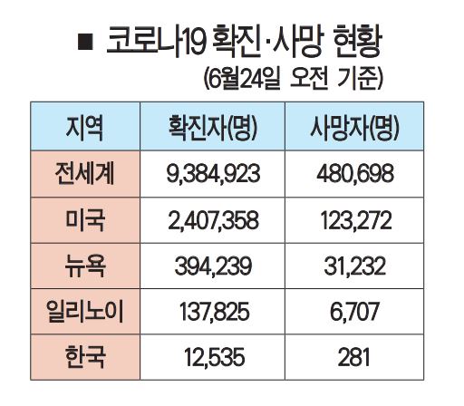 CNN방송은 23일, 일일 신규 확진자 수가 지난주 평균보다 높은 주가 25곳에 달한다고 전했다. 캘리포니아(5,019명) 텍사스(5,489명) 플로리다(3,286명) 조지아(1,750명) 등에서 발병이 많았고, 애리조나(3,593명) 네바다(462명) 미주리(434명) 등 3개 주는 하루 감염 최고치를 경신했다. 이날 미 전역 확진자도 3만3,730명을 찍어 4월 25일(3만4,203명) 이후 최다를 기록했다.