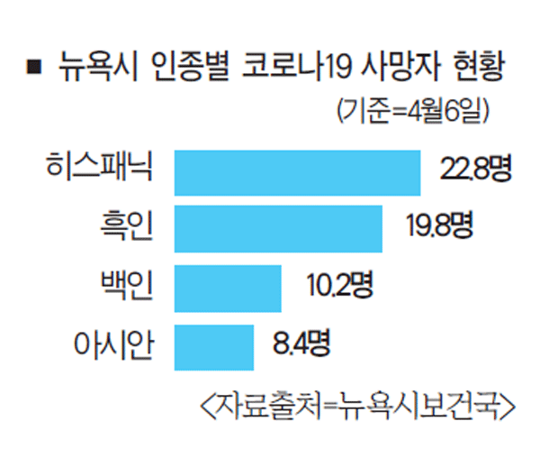 뉴욕시보건국이 7일 코로나19 확진자와 사망자의 지역과 인종, 성별, 나이 등으로 분류해 발표한 자료에 따르면 6일까지 히스패닉계 사망자는 521명으로 인구 10만명당 22.8명이 숨진 것으로 조사됐다.