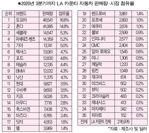 현대·기아·제네시스 등 한국산 3개 브랜드는 올해 3분기까지 2만3,981대가 팔려 전년 동기의 2만6,137대에 비해 9.0%(2,156대) 감소하는데 그치며 시장 점유율을 끌어올렸다. 특히 LA 카운티의 경우 기아차 점유율이 5.0%로 현대차의 3.5%보다 월등히 높아 주목을 끌었다.