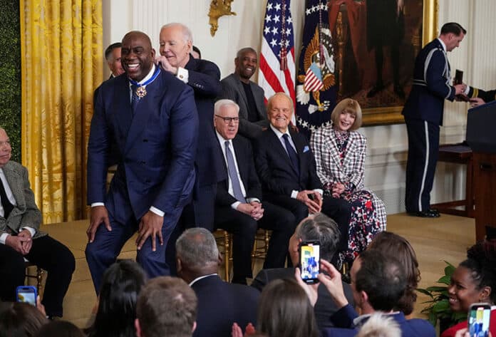 왕년의 농구스타 매직 존슨에 자유메달 걸어주는 바이든 [로이터]