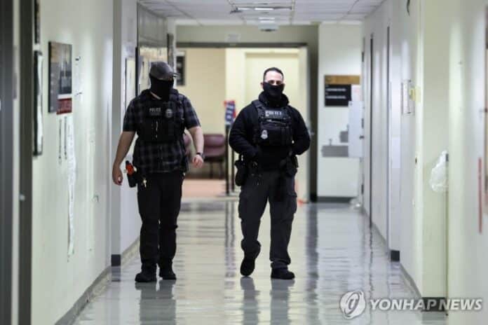 지난달 13일(현지시간) 미국 뉴욕시 페더럴 플라자 이민법원의 모습. 마스크를 쓴 연방요원들이 복도를 걷고 있다.[AFP 연합뉴스 자료사진. 재배포 및 DB 금지]