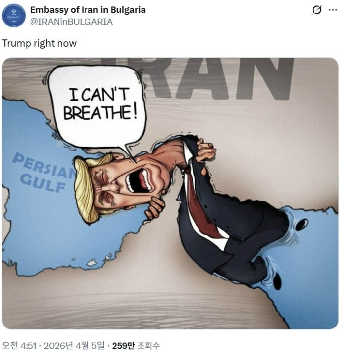 주불가리아 이란 대사관은 트럼프 대통령이 페르시아만 호르무즈 해협 사이에 낀 모습을 그린 만평을 엑스에 올리며 “지금의 트럼프”라고 표현했다.
