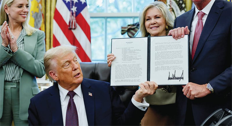 도널드 트럼프 대통령이 15일 테네시주 멤피스의 심각한 범죄 문제를 해결하기 위해 주방위군과 연방 기관 요원들을 투입하겠다고 밝혔다. 이는 멤피스에서 대대적인 범죄 척결 및 이민 단속 작전을 예고한 것으로 풀이된다. 트럼프 2기 들어 치안을 이유로 군대를 투입하는 것은 LA, 워싱턴 DC에 이어 세 번째다. 트럼프 대통령이 이날 백악관 집무실에서‘멤피스 안전 태스크포스 구성’을 지시하는 행정명령에 서명한 뒤 이를 들어보이고 있다.