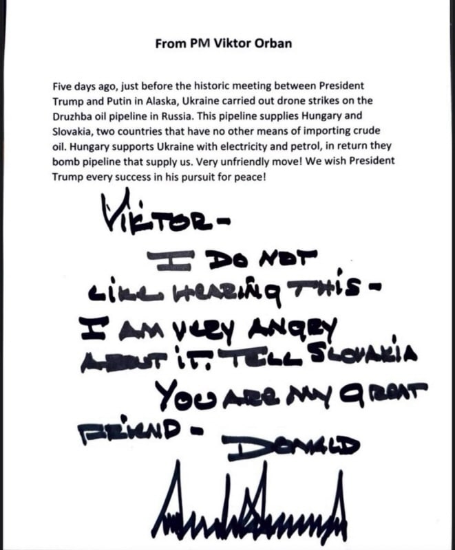 이 서한을 보면 오르반 총리는 “닷새 전, 트럼프 대통령과 푸틴 대통령 간 역사적 회담 직전 우크라이나가 러시아 내 드루즈바 송유관에 대한 드론 공격을 감행했다”며 “이 송유관은 헝가리와 슬로바키아에 석유를 공급하는데 두 나라는 이 외에는 석유를 수입할 방법이 없다”고 주장했다.
