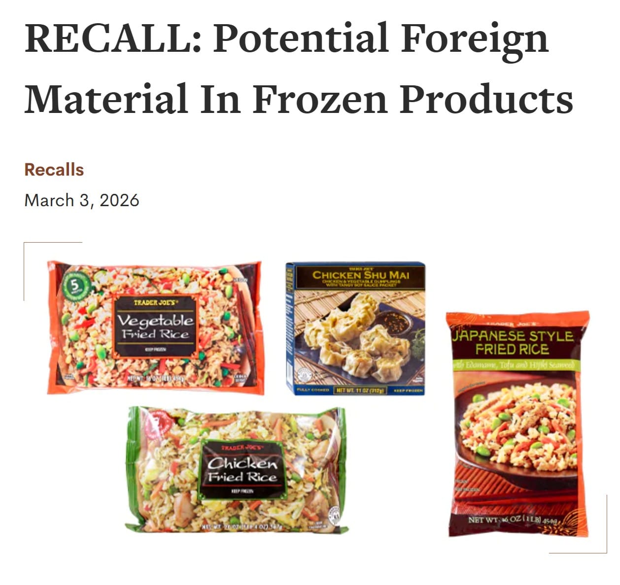미국 내 한인 소비자들에게 인기 있는 ‘트레이더 조’의 냉동 볶음밥과 일부 냉동식품에서 유리 파편 혼입 가능성이 확인돼 대규모 리콜이 진행된다. 이번 리콜에는 랠프스와 코스코에서 판매되고 있는 일부 제품도 포함되며, 구매자는 제품을 폐기하거나 매장에서 환불받을 수 있다.