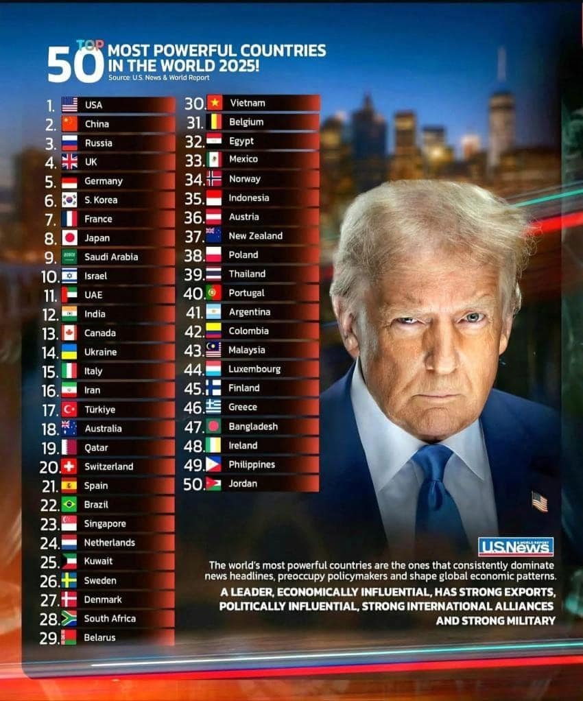 이 순위는 US뉴스가 매년 발표하는 ‘세계 최고의 국가'(Best Countries) 보고서의 하위 항목 중 하나로 지도자, 경제적 영향력, 수출, 정치적 영향력, 국제 동맹, 군사력 등 여섯 가지 항목으로 국력을 평가했다.