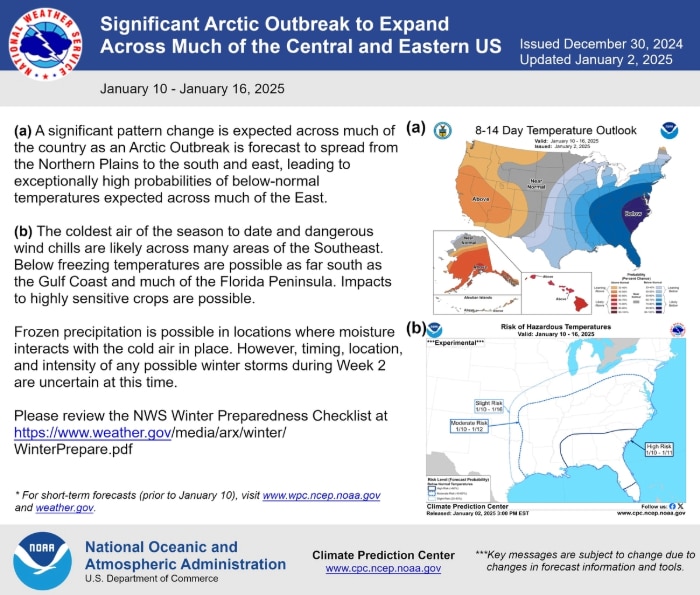 플로리다를 포함한 미국 남동부에는 올 겨울 들어 가장 심한 한파와 찬 바람이 닥칠 것으로 전망되며, 가장 남쪽인 플로리다 반도에서도 영하로 내려가는 지역이 많을 것이라고 NWS는 경고했다.