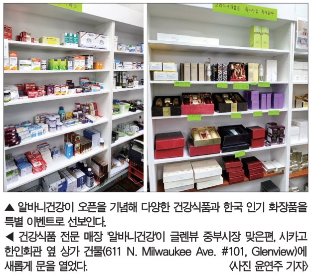 30년 넘게 한인들의 건강을 지켜온 알바니 약국이 건강 전문 매장 ‘알바니건강(ALBANY HEALTH)’으로 새 단장 오픈하며 새로운 도약에 나섰다. 지난 10월 13일 문을 연 매장은 글렌뷰 중부시장 맞은편, 시카고 한인회관 옆 상가(611 N. Milwaukee Ave. #101, Glenview)에 자리해 한인 고객들의 접근성을 한층 높였다.