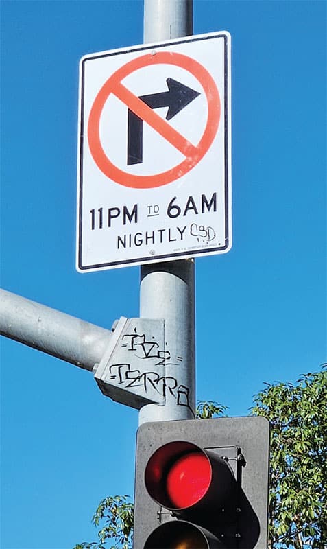 웨스턴길의 매춘 방지를 위한 심야 우회전 금지 사인판. [박상혁 기자]