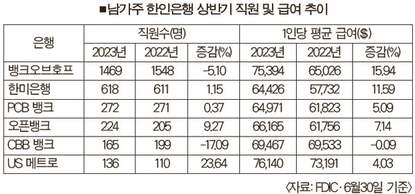 한미은행이 뱅크오브호프에 이어 두 번째로 가장 많은 급여 인상폭을 기록했다. FDIC에 따르면 한미은행의 상반기 1인당 평균 급여는 6만 4,426달러로 전년 동기(5만7,732달러) 대비 11.59% 증가했다. 한미은행의 직원 급여는 한인 은행 업계에서 가장 적은 수준이었는데 이번 인상으로 키맞추기를 어느 정도 달성했다. 다만 아직도 한미은행의 1인당 평균 급여는 6개 은행 중 가장 낮은 수준이다. 상반기 인상 폭이 컸던 만큼 앞으로는 1인당 평균 급여가 다른 은행들을 넘어설 가능성은 있다.