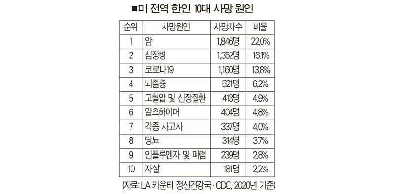 코로나19 감염에 따른 사망은 그해 미국 내 한인 사망 원인 3위를 차지해 코로나 사태가 한인사회의 전반적 건강에 큰 영향을 미쳤음을 확인시켜줬다. 한인 사망 원인 부동의 1위는 ‘암’이었고, 심장병, 코로나19, 뇌졸증, 고혈압 등이 그 뒤를 이었다.