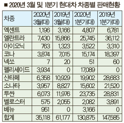 1일 발표된 현대차 미국판매법인(HMA)의 올해 3월 미국시장 판매실적에 따르면 현대차는 3만5,118대를 판매해 전년 동월의 6만1,177대와 비교해 43%가 감소했다고 밝혔다. 또한 3월 실적 악화에 따라 올해 1분기 실적(13만875대)은 지난 1월과 2월 매출 증가에도 불구하고 전년동기 대비 11% 감소세를 나타냈다.