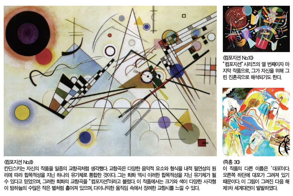 칸딘스키는 정신적이고 심리적인 추상 미술을 점, 선, 면 등 순수한 회화의 요소만으로 표현했다. 작품의 제목에도 ‘구성’, ‘음향’, ‘즉흥’ 등이 많다. 그는 음악이 그림이 될 수도, 그림이 음악이 될 수도 있다고 믿었다.
