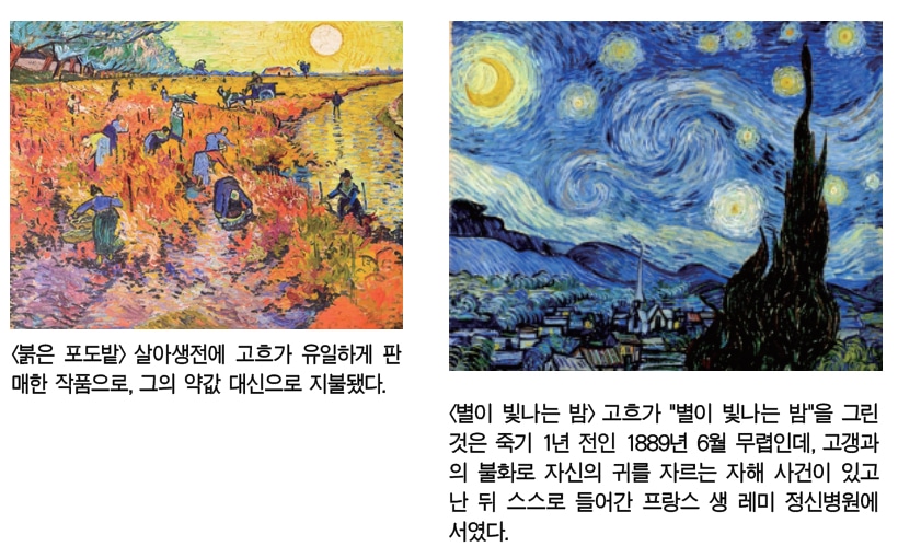지금은 고흐의 그림이 가치를 인정받아 수천만 달러에 거래되지만 고흐가 생전에 판 작품은 단 한 점, ‘붉은 포도밭’이었다. 그는 평생을 동생 테오의 보살핌으로 살아가야만 했다.