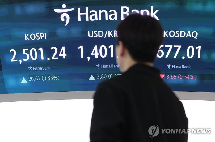 이날 코스피 지수 종가는 전날보다 0.83% 오른 2,501.24을 기록했다. 코스닥 지수는 전날보다 0.54% 내린 677.01로 마감했다.