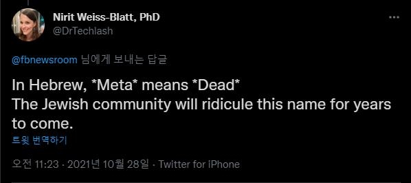 한 트위터 이용자는 “누군가 브랜딩 연구를 (제대로) 안 했다”고 썼고, 정보기술(IT) 저널리즘과 홍보를 연구하는 니릿 와이스-블랫 박사는 “히브루어로 메타는 ‘죽은’을 뜻한다. 유대인 공동체는 앞으로 수년간 이 이름을 조롱할 것”이라는 트윗을 올렸다.