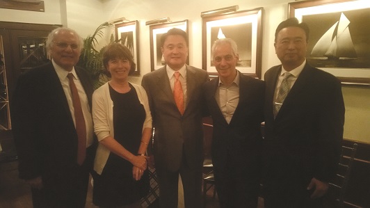 지난 26일 시카고시내 깁슨 레스토랑에서 열린 마가렛 로리노 시카고시의원(39지구) 후원의 밤에 참석한 인사들이 기념촬영을 했다.(왼쪽부터 앤소니 채피키스 변호사, 로리노 시의원, 오희영 GNS 회장, 람 임마뉴엘 시카고 시장, 이진 교육위원)<사진=로리노시의원실>
