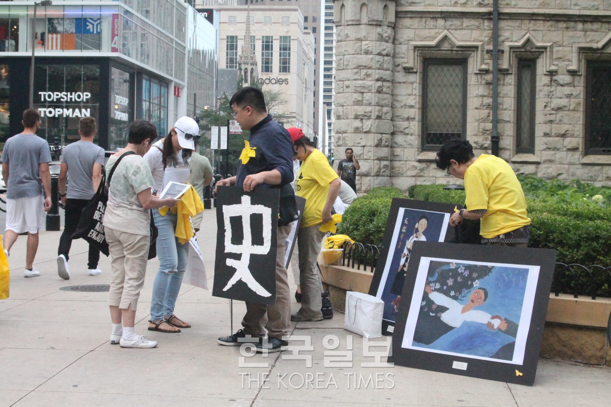 이날 집회에는 미대륙을 자전거로 횡단하며 위안부 문제를 홍보하고 있는 3기 ‘3A프로젝트’팀(하주영·조용주)와 여성핫라인(사무국장 지영주), 시카고지역 3A프로젝트 후원회(코디네이터 박건일), 시카고위안부소녀상건립추진위원회 루시 백 위원장, 3A프로젝트팀과 LA부터 시카고까지 함께 동반횡단한 시카고콜럼비아대 재학생 소피 마네르츠 등 20여명이 함께 했다.