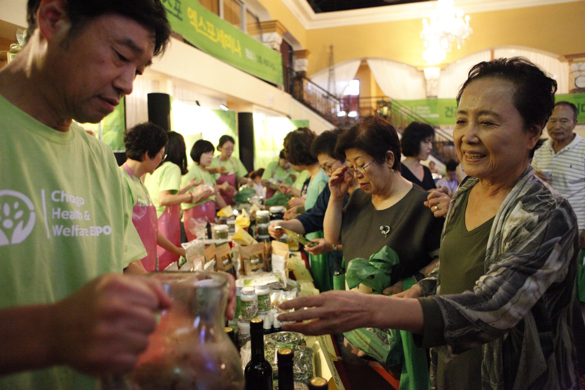 건강식품판매 부스에 참여한 ‘건강마을’ 관계자가 엑스포 참석자들에게 건강 차를 제공하고 있다.