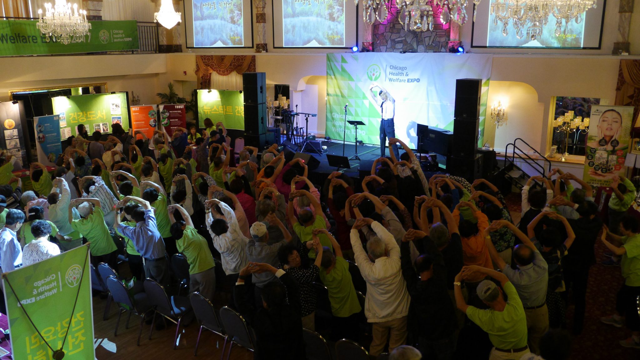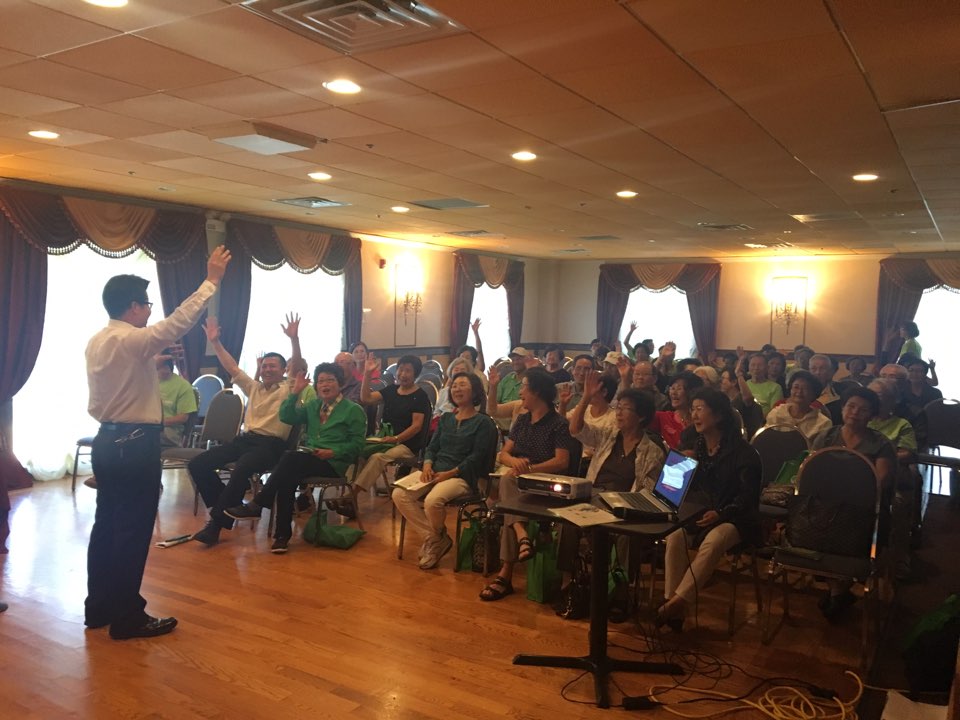 한종근 원장의 삼위일체 건강법 세미나에서 참석자들이 손을 들어 대답하고 있다.