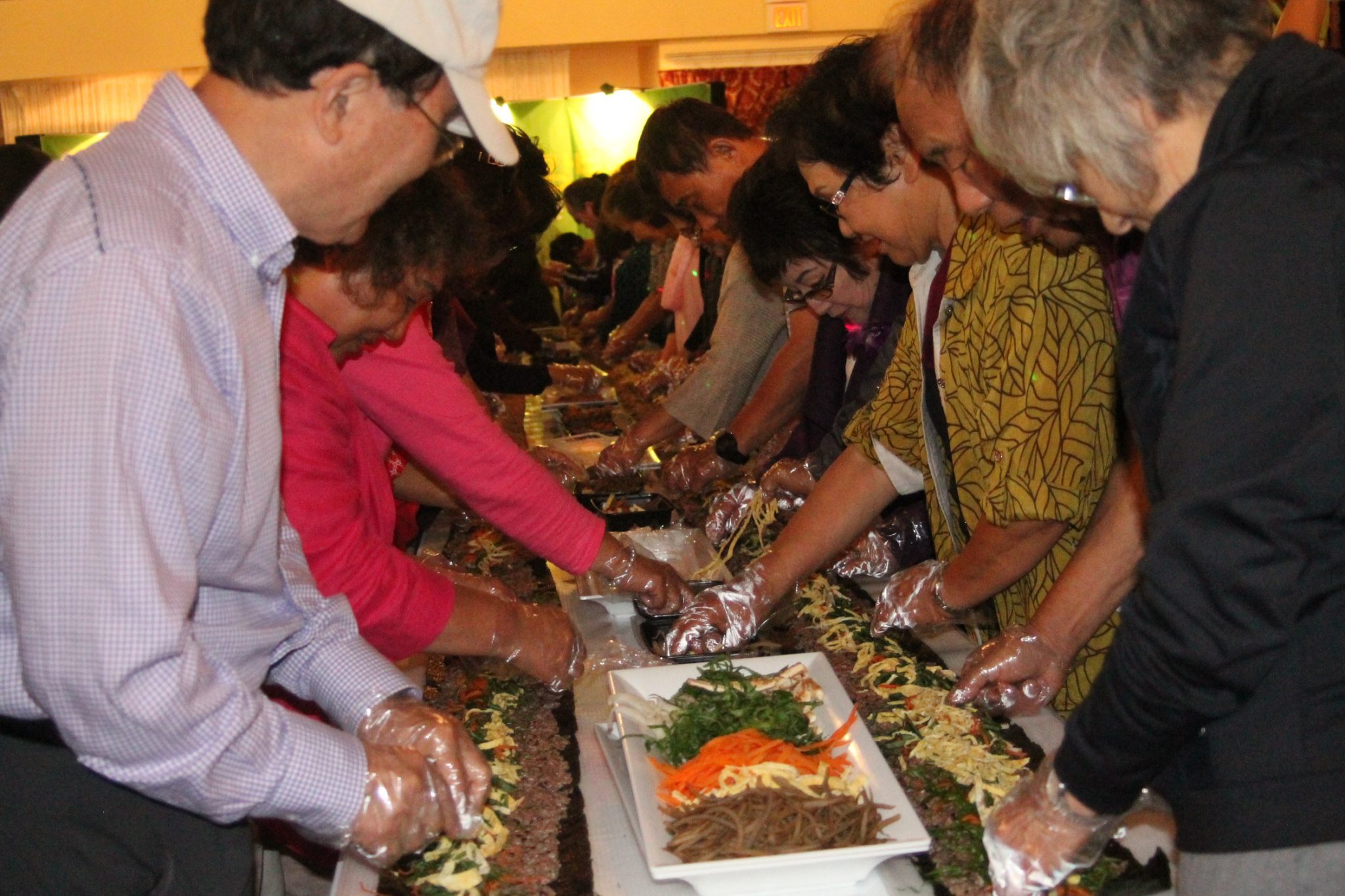 건강김밥말기 이벤트에서 참석자들이 다 함께 160피트의 김밥을 만들고 있다.