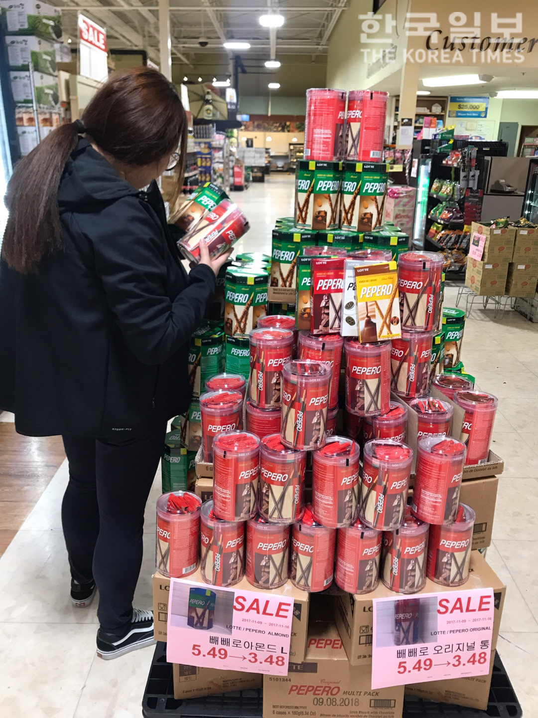 11월 11일이라는 숫자가 과자 빼빼로를 닮은 것이 유래된 ‘빼빼로 데이’를 맞아 시카고지역 한인마트들도 다양한 할인 이벤트를 실시하고 있다. 지난 9일 나일스 아씨플라자에 설치된 빼빼로 판촉대에서 여성 고객이 제품을 고르고 있다.<홍다은 기자>